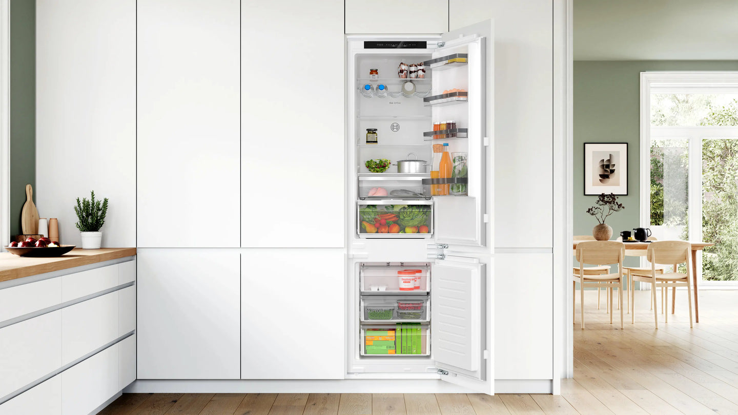 The large built-in fridge freezer with 12% more cooling volume or 1 extra shelf including VitaFresh XXL <0°C> system, No Frost and error warning signal for optimal storage.