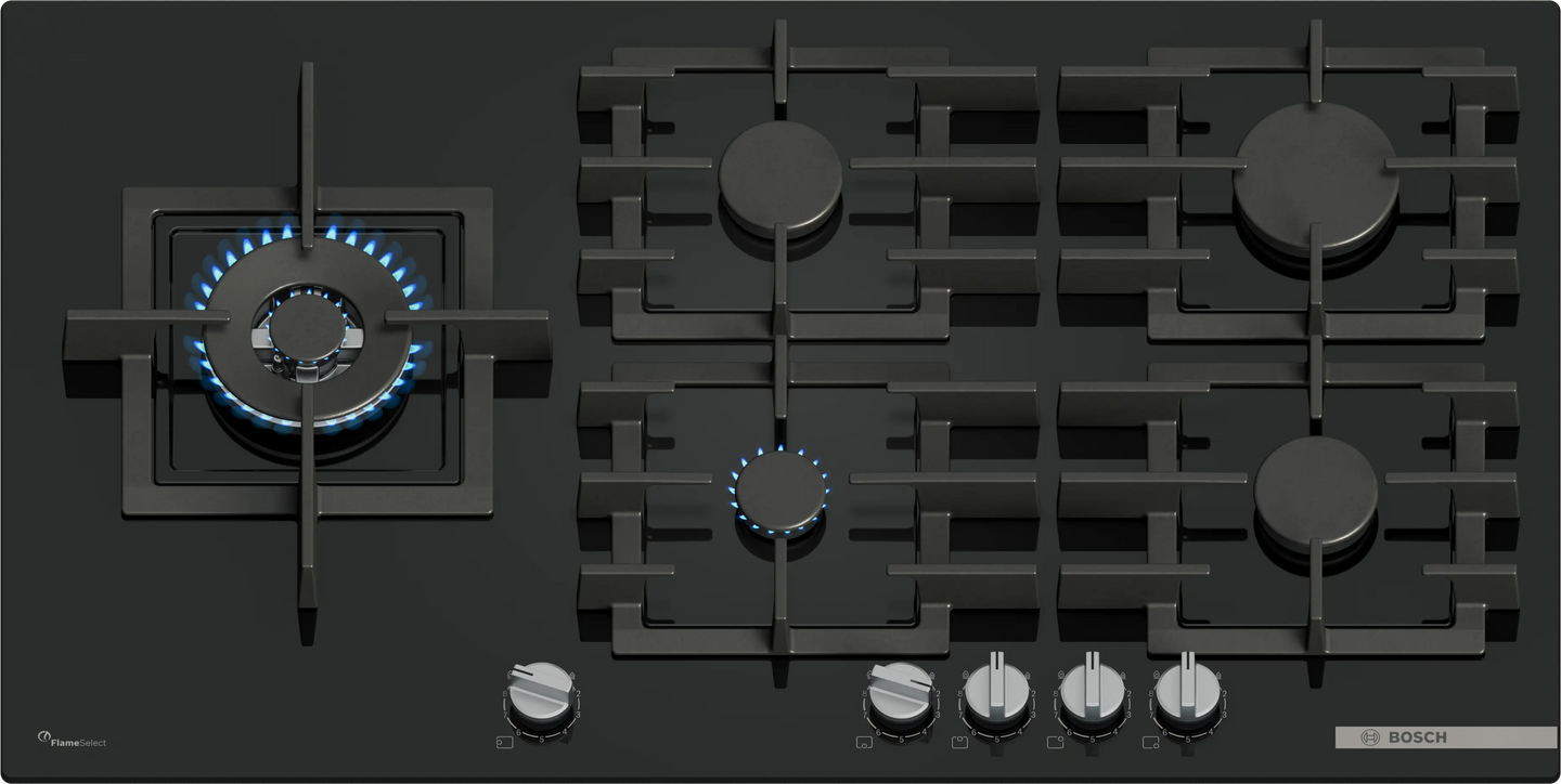 Bosch PPM9A6I40 Series 6 92cm 5 Burner Gas Hob, Black Tempered Glass