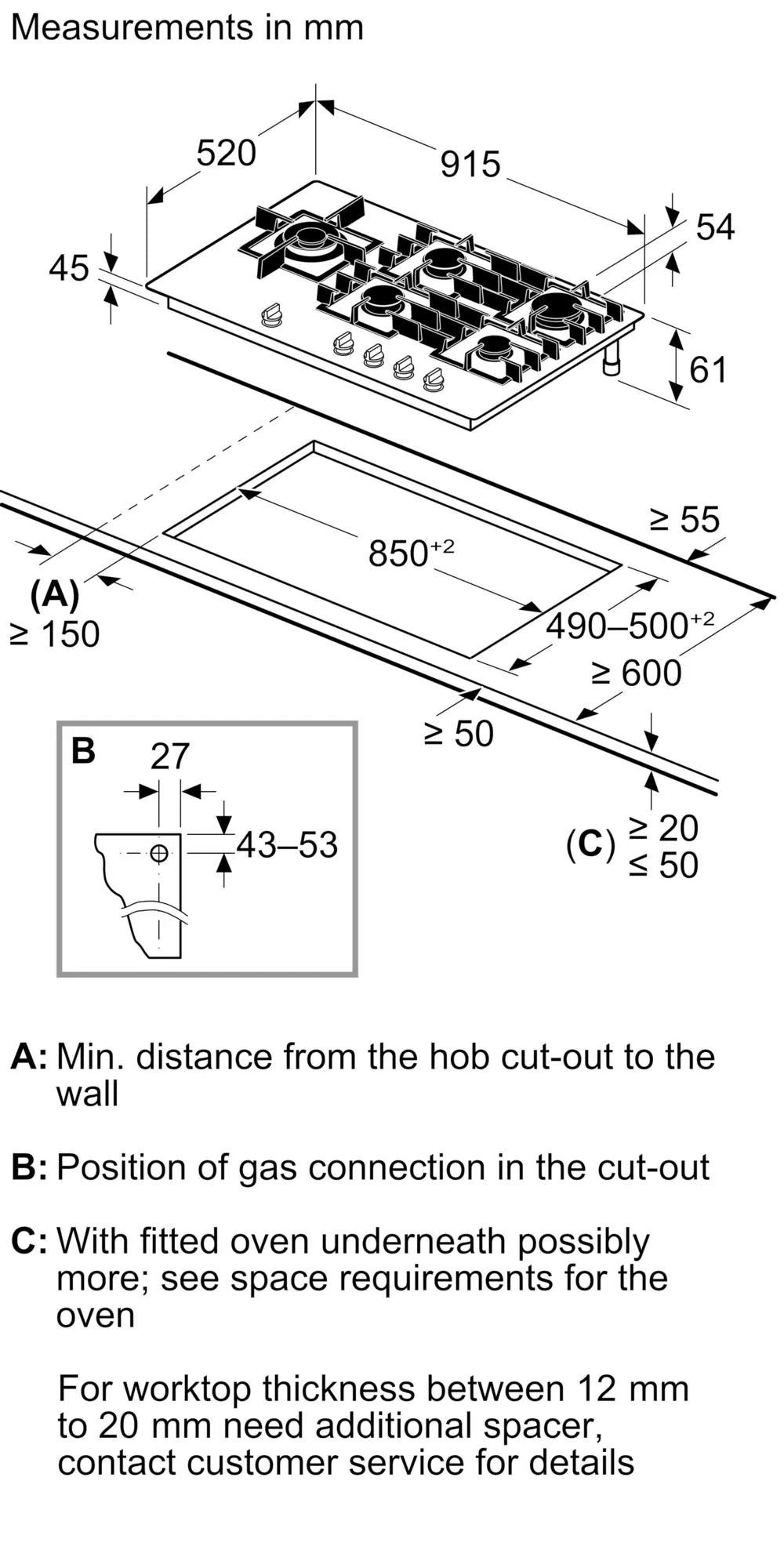 Product Dimensions (HxWxD) (mm) - 54 x 915 x 520