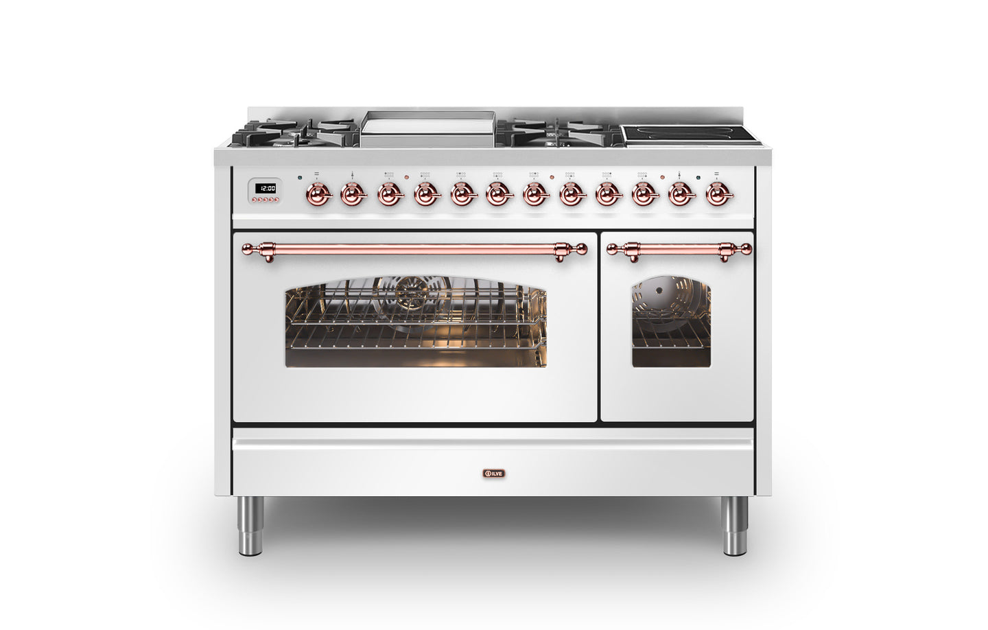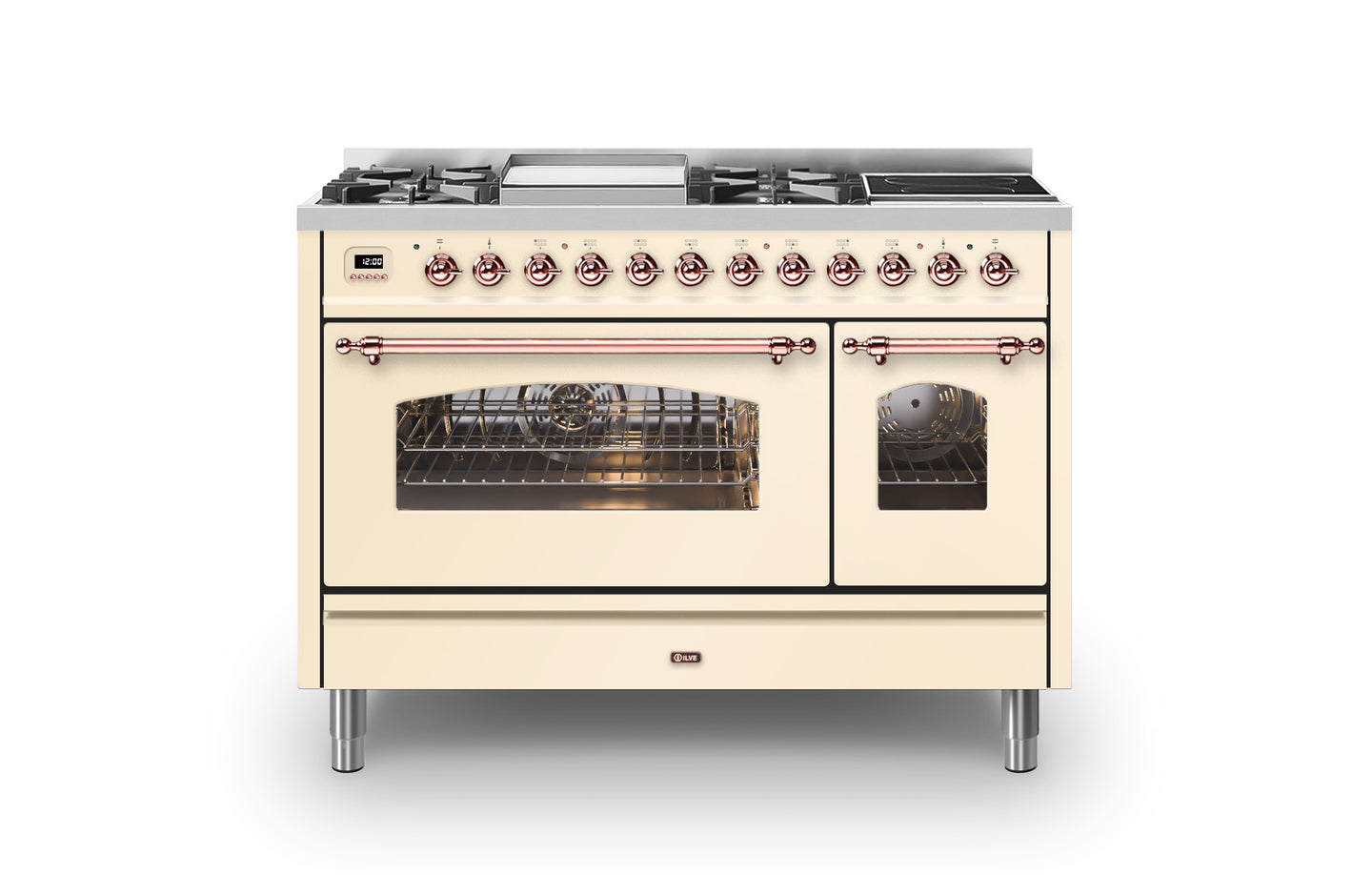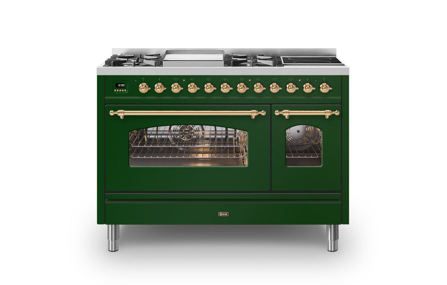 The 120 cm Milano range cooker has a beautiful Italian design that will create a statement in any traditional kitchen. This Milano range cooker has two large electric ovens with triple glass cool doors. The oven on the right has a 43 litre capacity, and the extra-large oven on the left has a 97 litre capacity. There is plenty of space to cook your favourite dishes. With ILVE’s soft closing door system, both oven doors and storage doors can be closed gently.