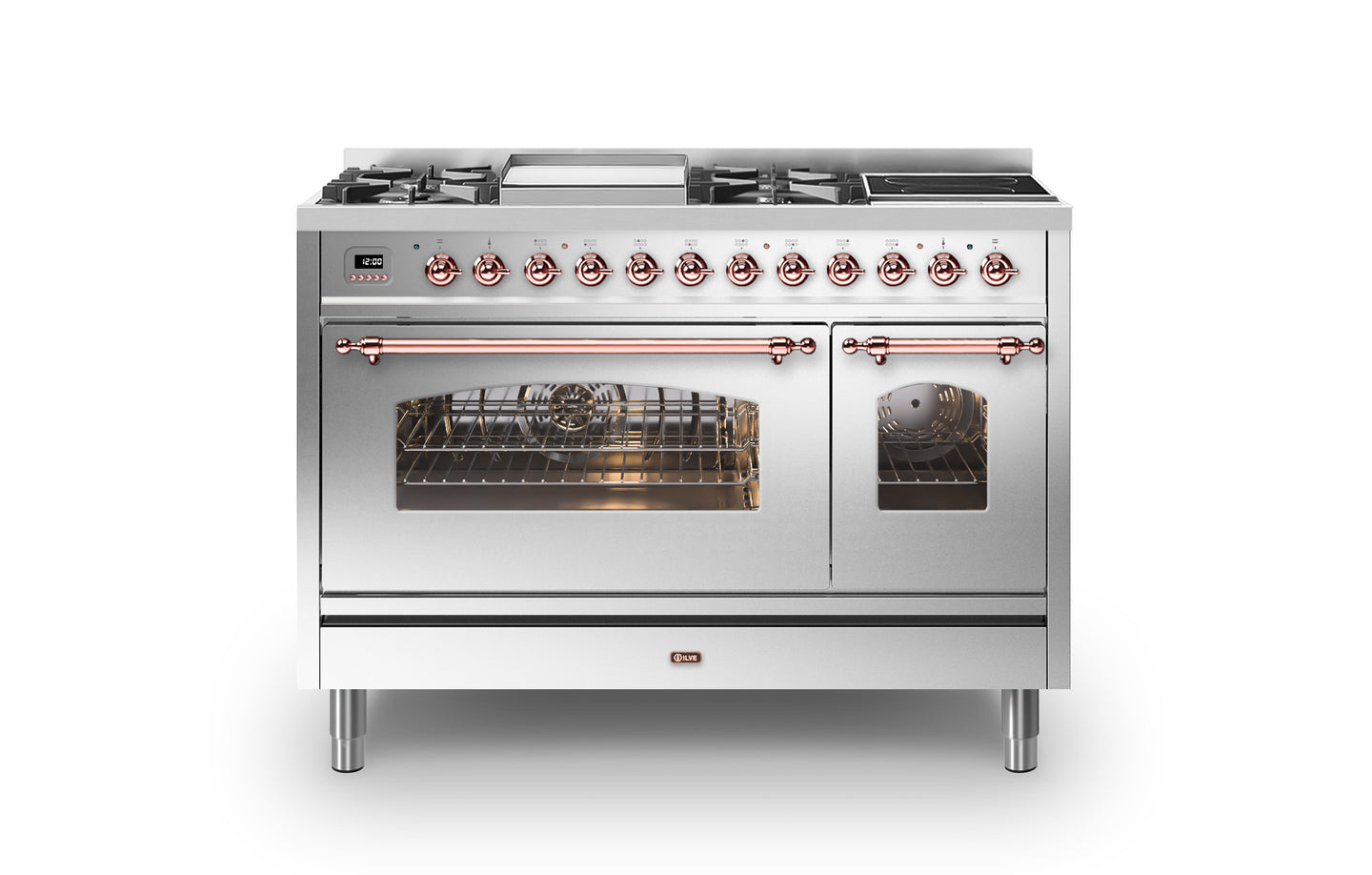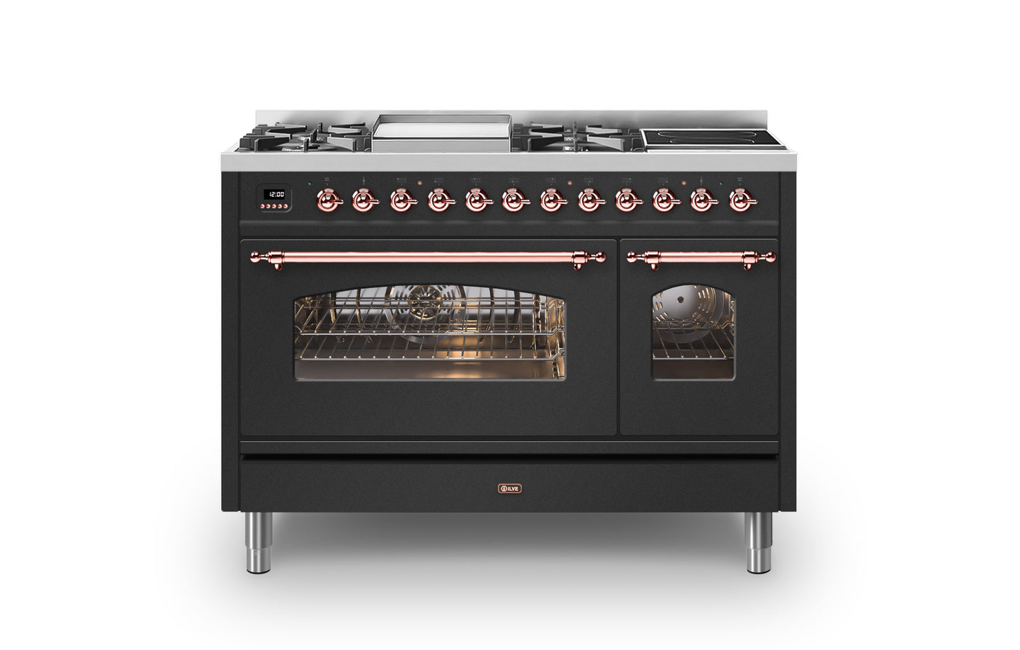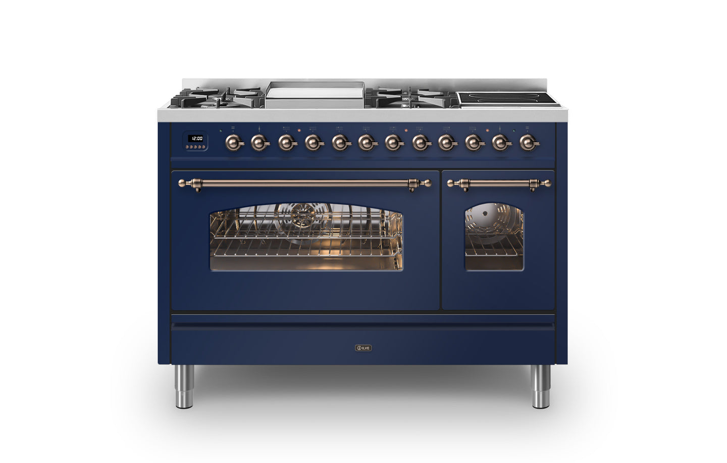 The 120 cm Milano range cooker has a beautiful Italian design that will create a statement in any traditional kitchen. This Milano range cooker has two large electric ovens with triple glass cool doors. The oven on the right has a 43 litre capacity, and the extra-large oven on the left has a 97 litre capacity. There is plenty of space to cook your favourite dishes. With ILVE’s soft closing door system, both oven doors and storage doors can be closed gently.