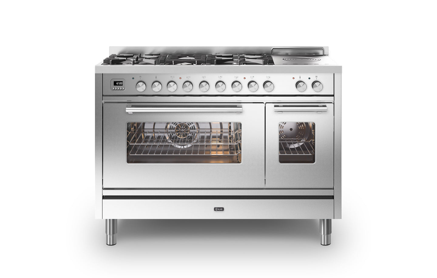 The ovens temperature ranges from 30 to 300 degrees, and is controlled by ILVE’s unique E3 precision temperature control. This system allows you to chose the exact temperature on the screen, instead of guessing the temperature on the ovens knob. Both ovens include a specially designed rotisserie, perfect for cooking joints of meat. There is a choice of 15 oven functions including quick start rapid heat up that heats to 200 degrees in just 6 minutes.