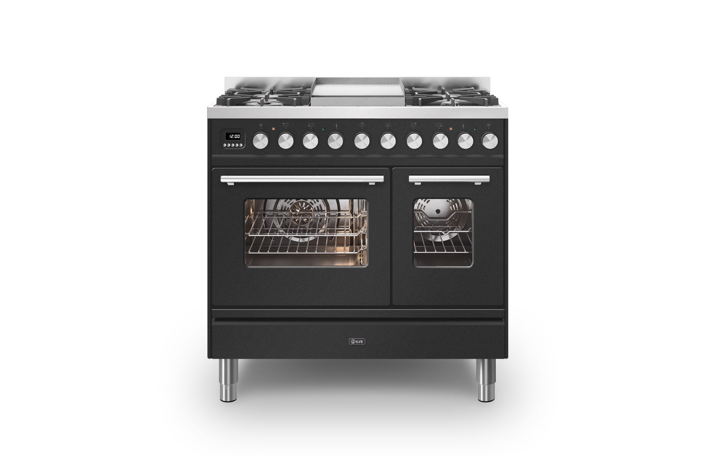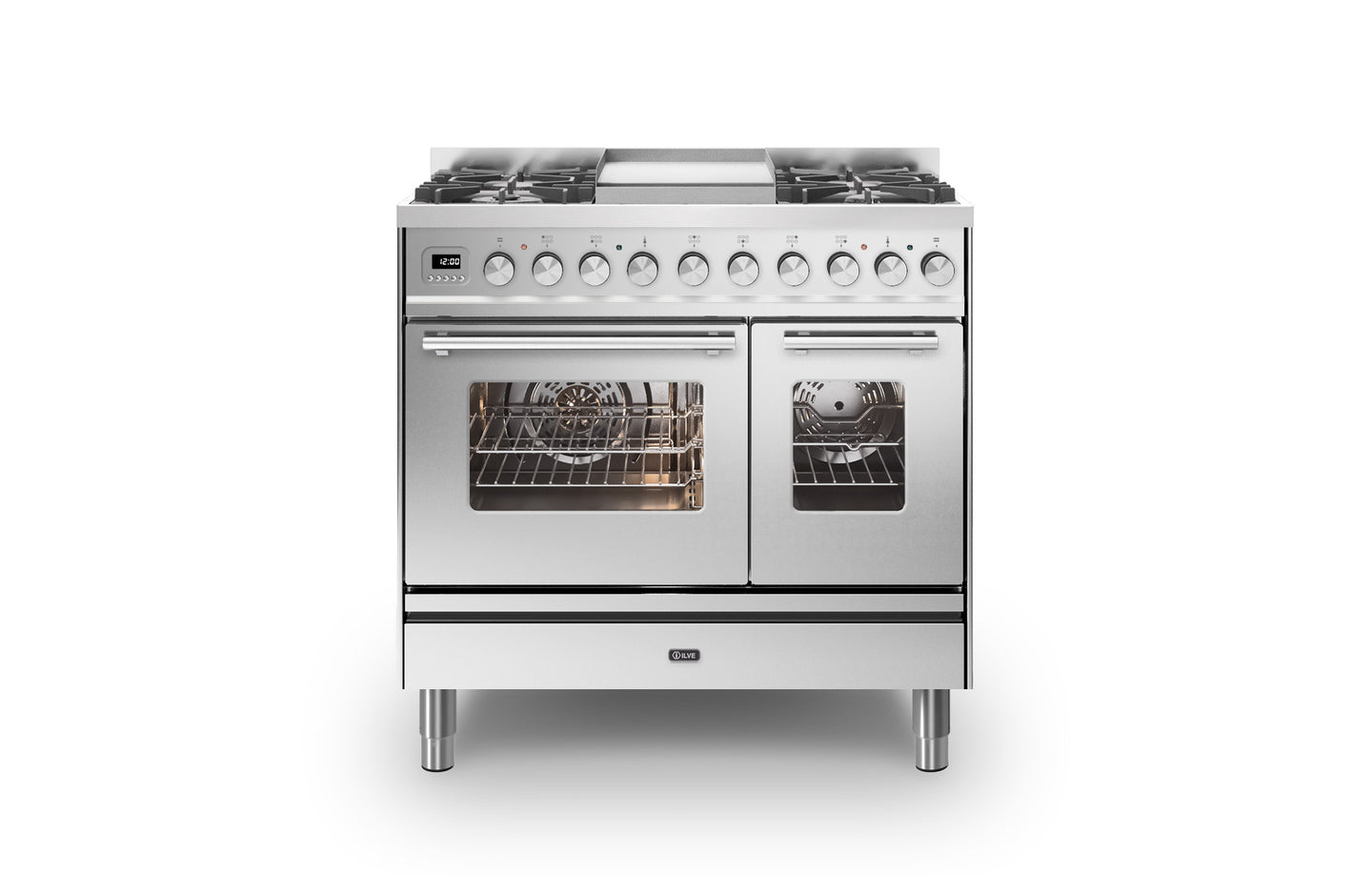 The 90 cm Roma range cooker has a contemporary design, perfect for any modern kitchen. This range cooker has two large ovens with a capacity of 43 and 65 litres. With ILVE’s soft closing door system, both oven doors and storage doors can be closed gently.